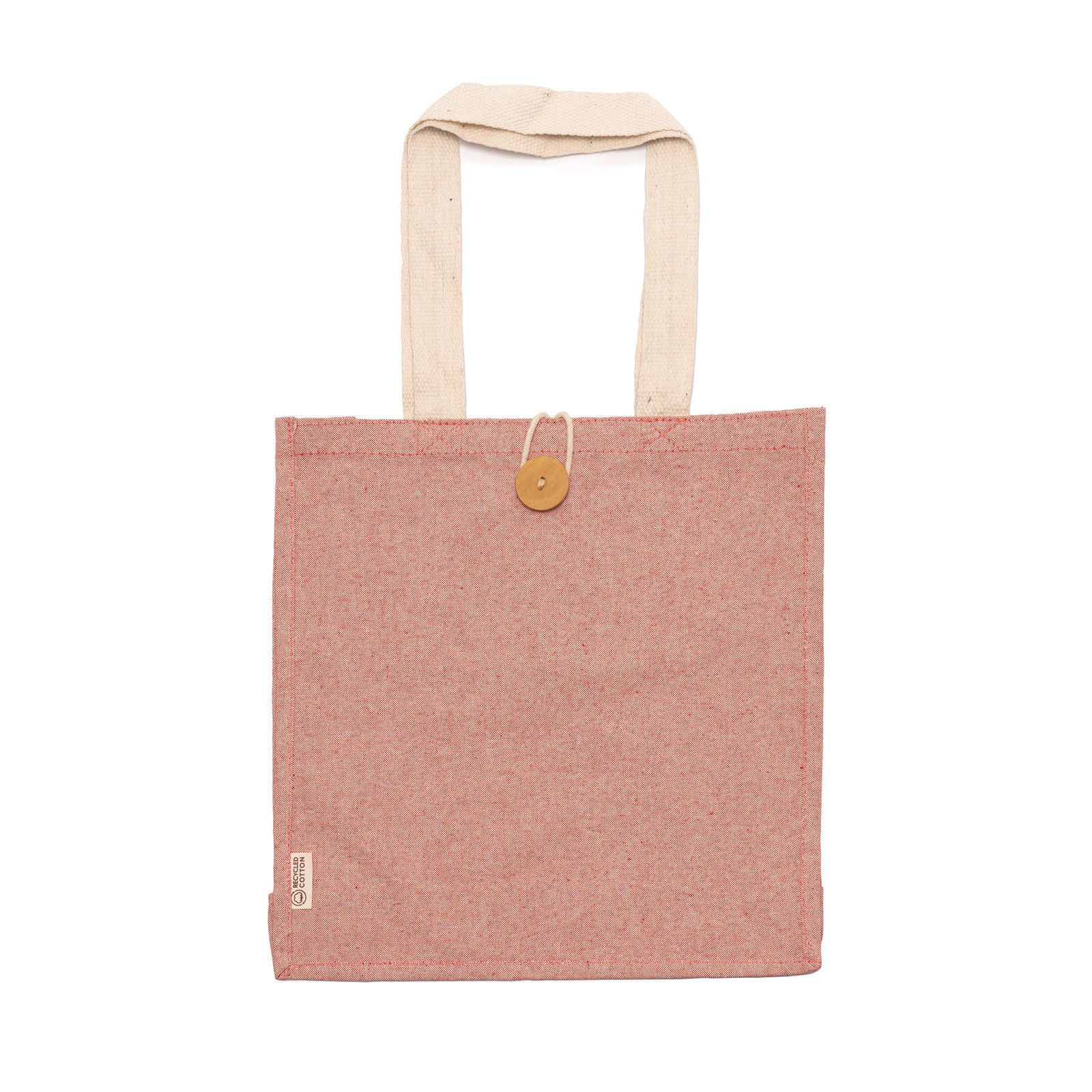 Recycled cotton bag in heather finish. Reinforced 70 cm long handles. Button fastening.Composition: cotton, 300g/m²
