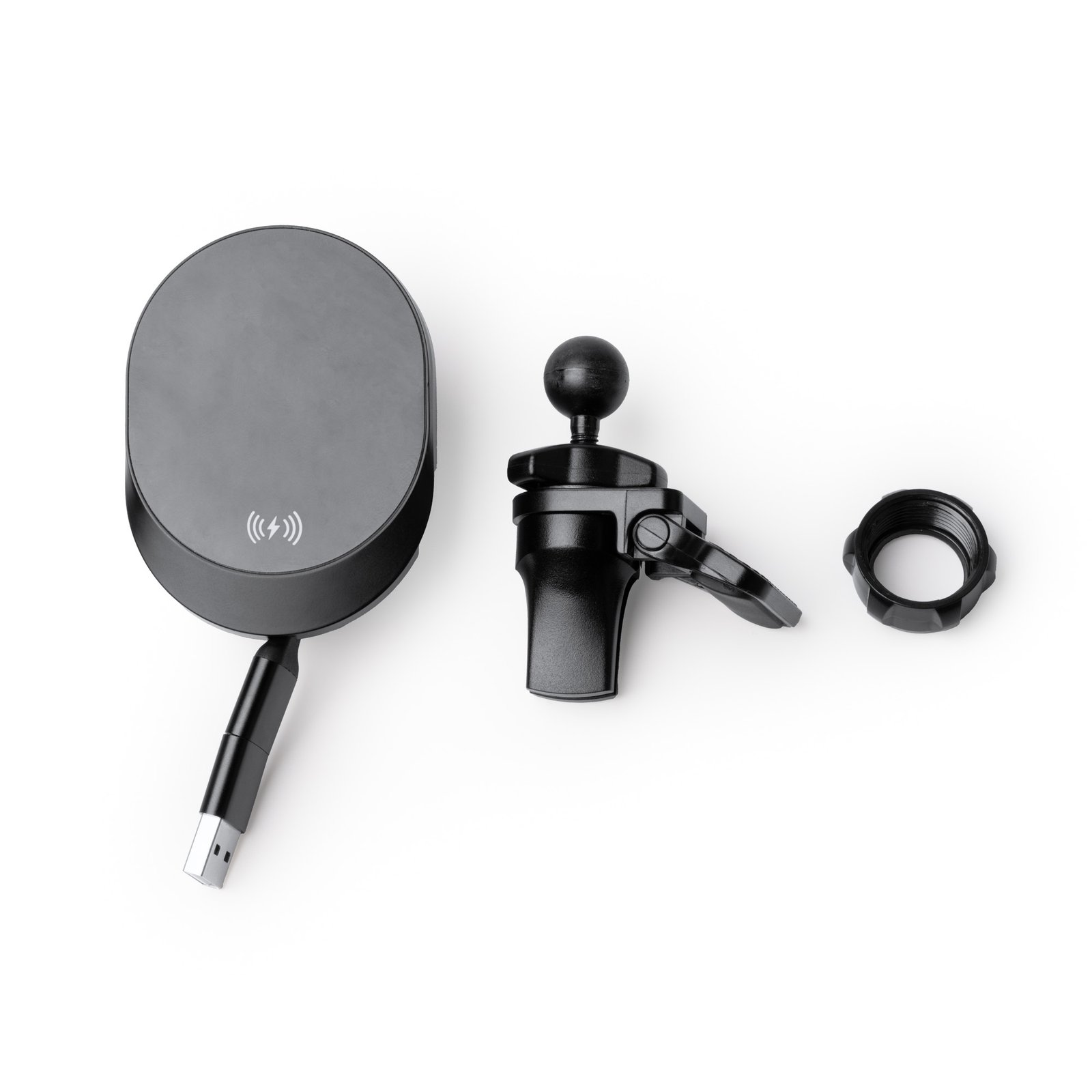 In car wireless charger for smartphone with output power up to 15 W. Features a built-in retractable Type C cable with a USB adapter. Includes a magnetic ring for the device and an air vent mounting accessory. Presentation in design box.