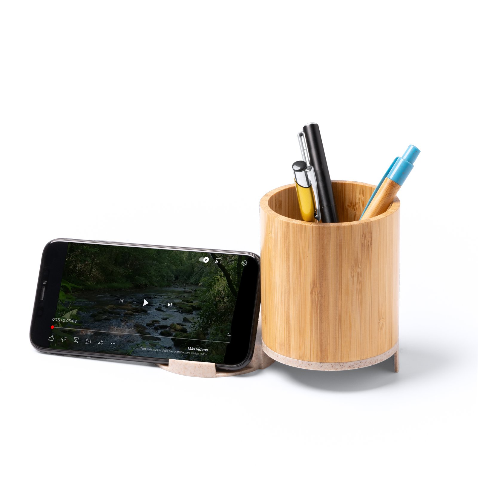 Pencil holder with main structure in bamboo and base with wireless charger function in wheat fibre. 15W output. USB port in-built in the base with two Type C and two USB output ports. Presentation in eco design box.