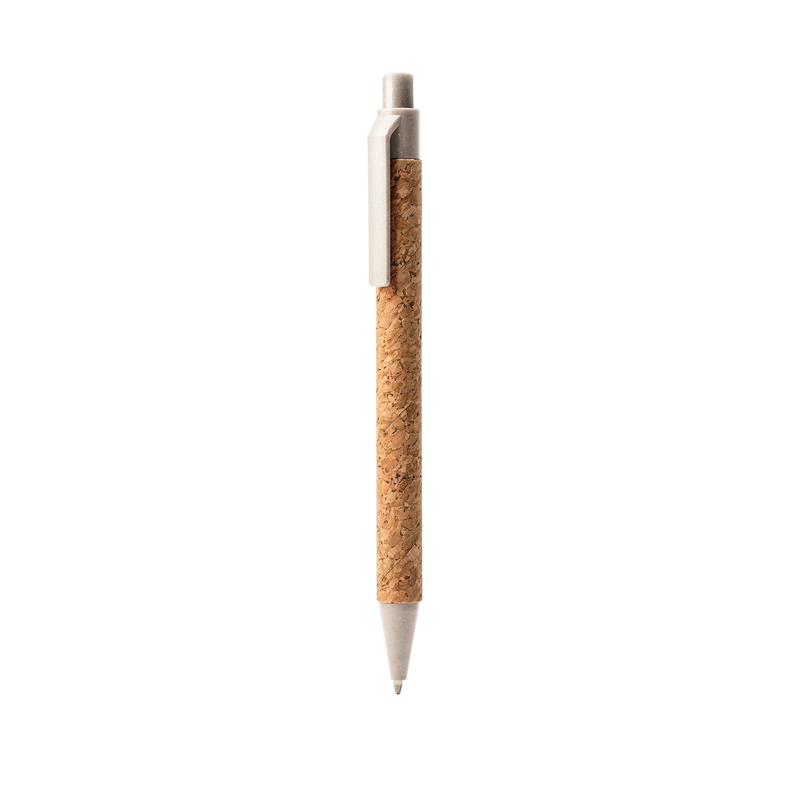Eco-line ball pen with body in cork. Tip, push button and clip in wheat fibre. Blue ink. Composition: Cork and wheat fibre.