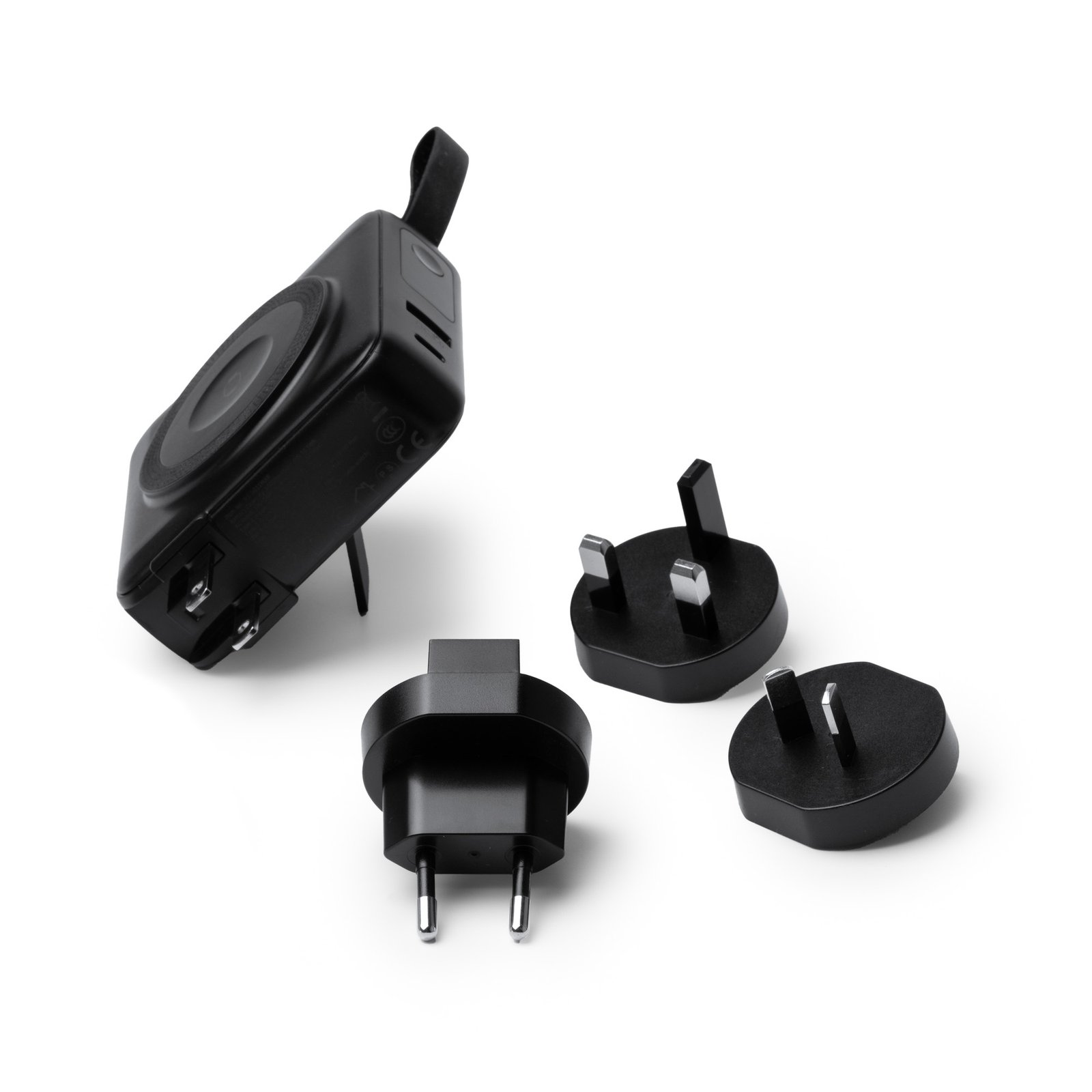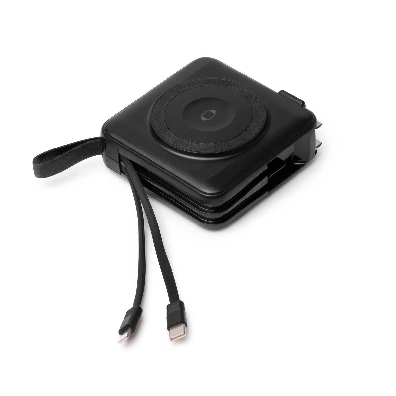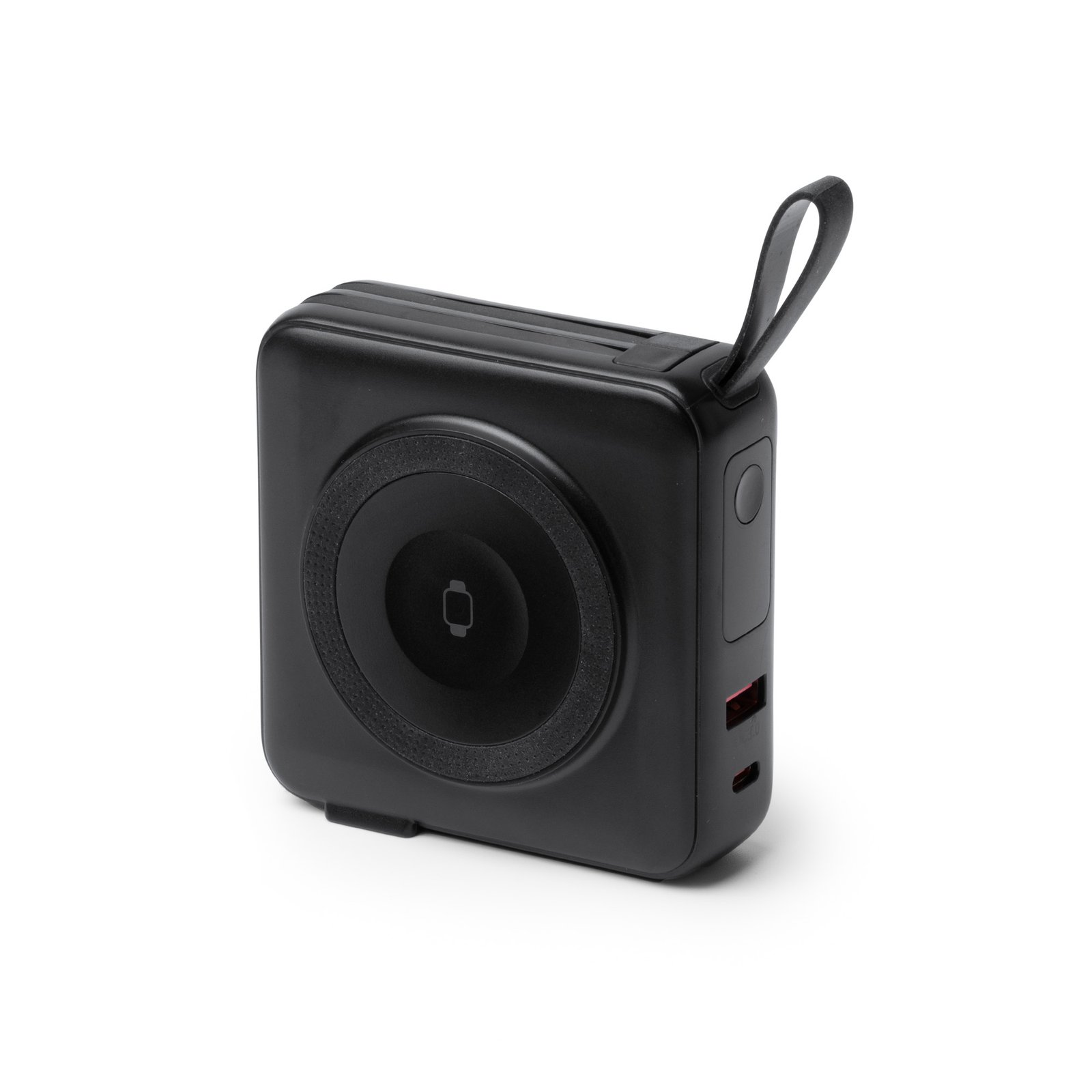 3-in-1 external battery of 10,000 mAh with fast charging, with power of 15W for wireless charging and 20W for charging by cable. made from ABS, with wireless charging base for devices that are equipped with this technology. Incorporates an integrated Type C connection cable and a Lightning cable built into the body, as well as a display with a charge percentage indicator. Includes USB and Type-C input and output ports, power adapters for different countries, allowing it to be used as a charging head. It can also be used wirelessly as a power bank. Includes a magnetic ring, a silicone strap for more comfortable carrying and use, as well as an integrated rear holding base that functions as a mobile phone stand. Its design and structure allow multiple devices to be charged at the same time. Presentation in design box.