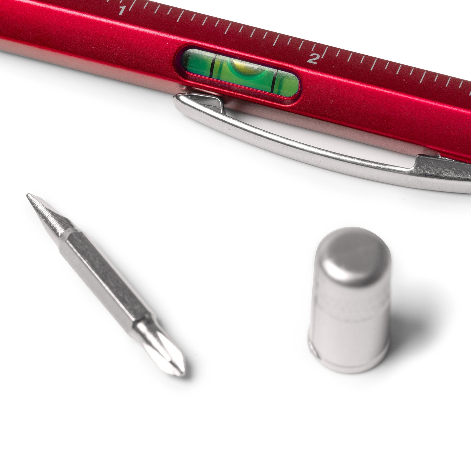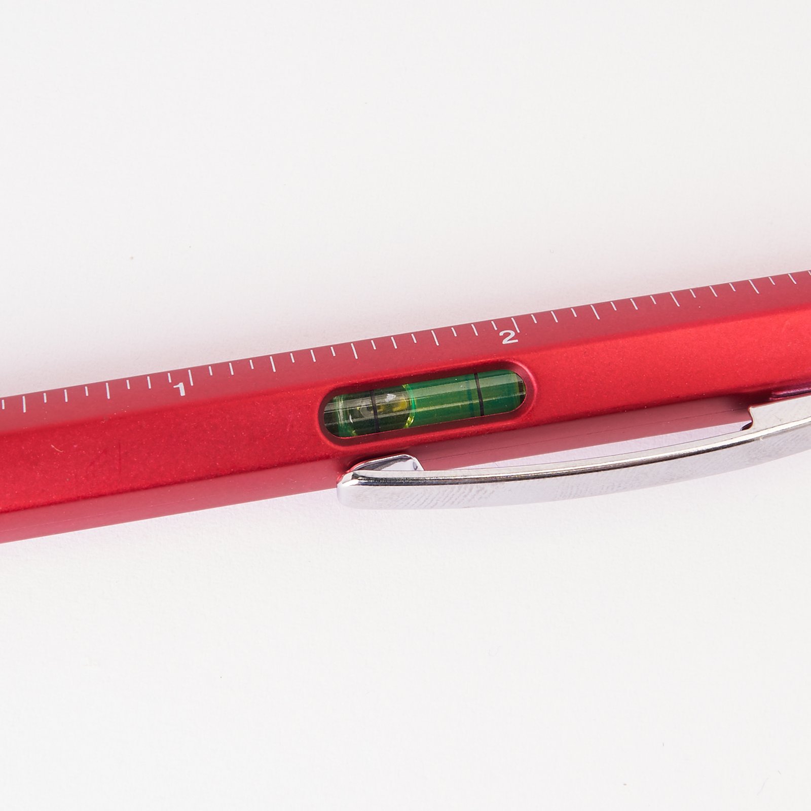 Multifunction ball pen with the following tools: level, ruler in centimeters and inches, flat screwdriver and star screwdriver. Main body available in different colours. Rotating mechanism. Blue ink.