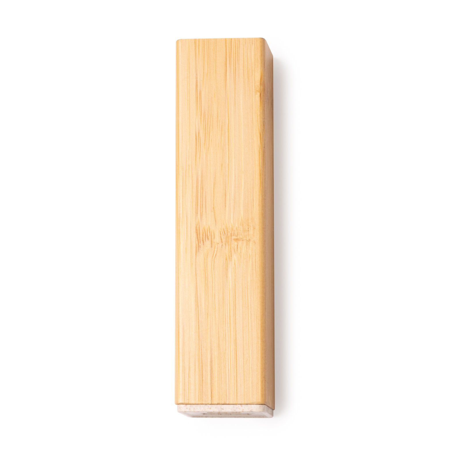Power bank with main structure in bamboo and wheat fibre. 2.200 mAh capacity. LED charging indicator. Type C input and output. Presentation in design box. Composition: Bambú y fibra de trigo. Remarks: Tipo de batería: Litium-ion