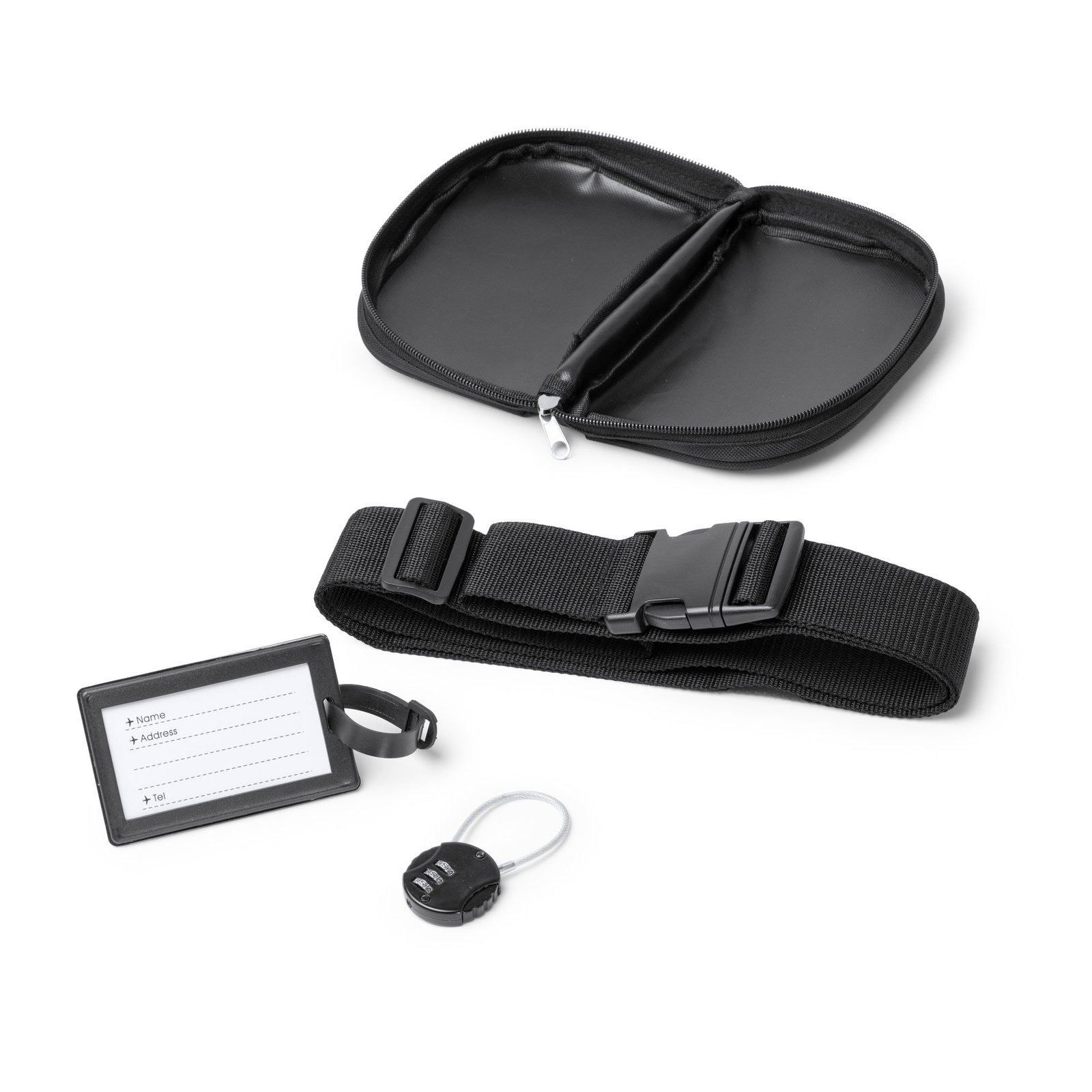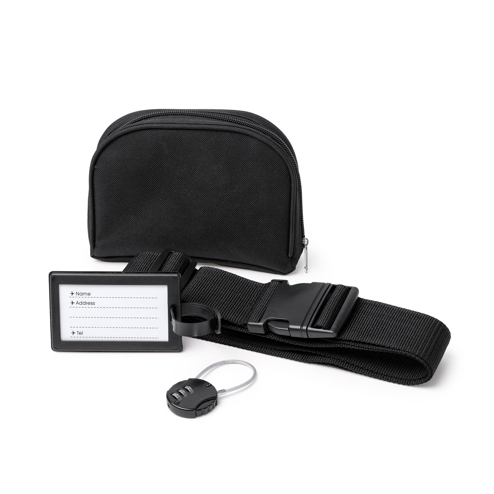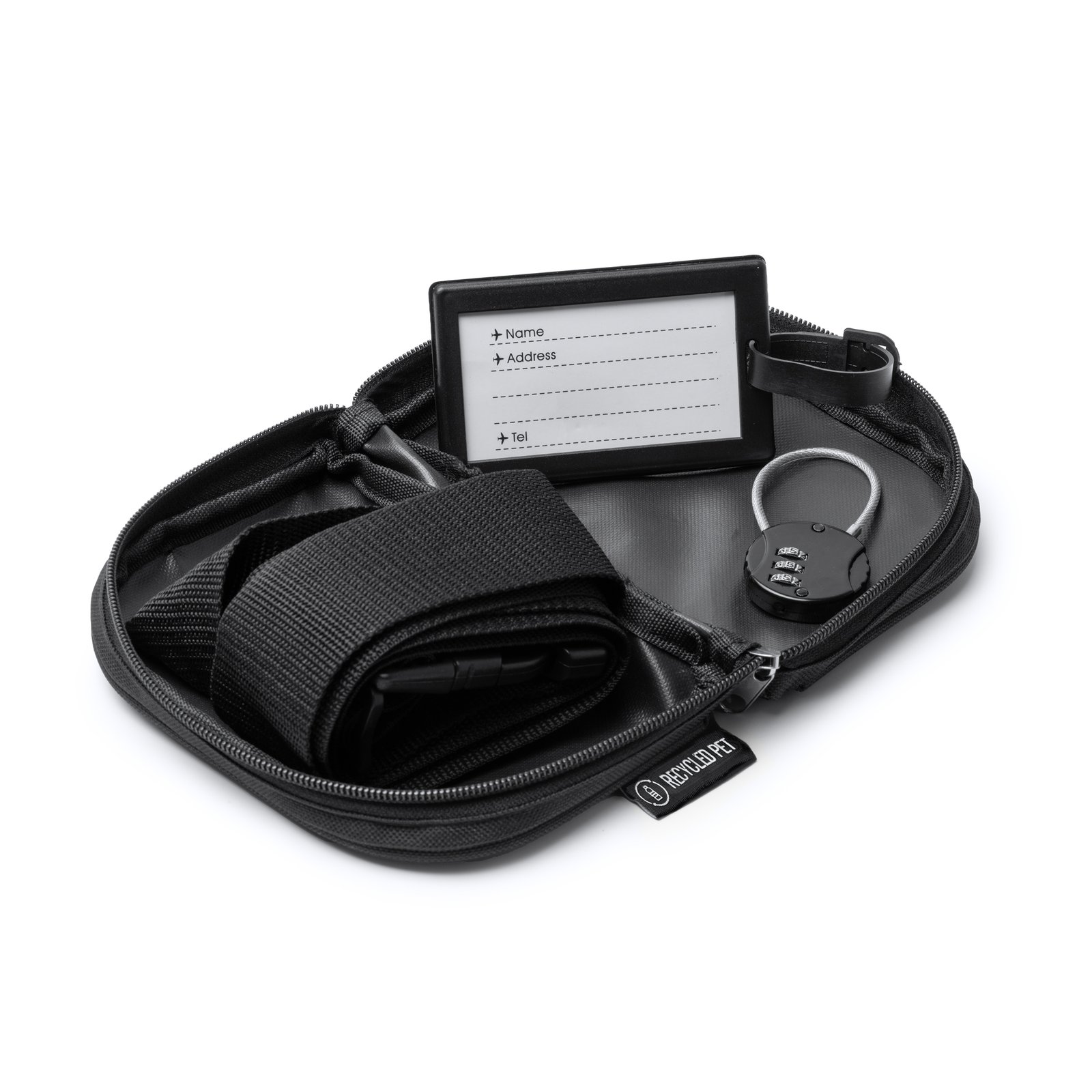 3-in-1 travel set. Includes padlock with three-digit numerical password, identification card made from PP and adjustable luggage strap for added security. All these accessories are presented in a case made from RPET, featuring a full opening zip closure. Composition: RPET, PU, PP, ABS Remarks: Total size of the adjustable strap: 180 cm x 5 cm.