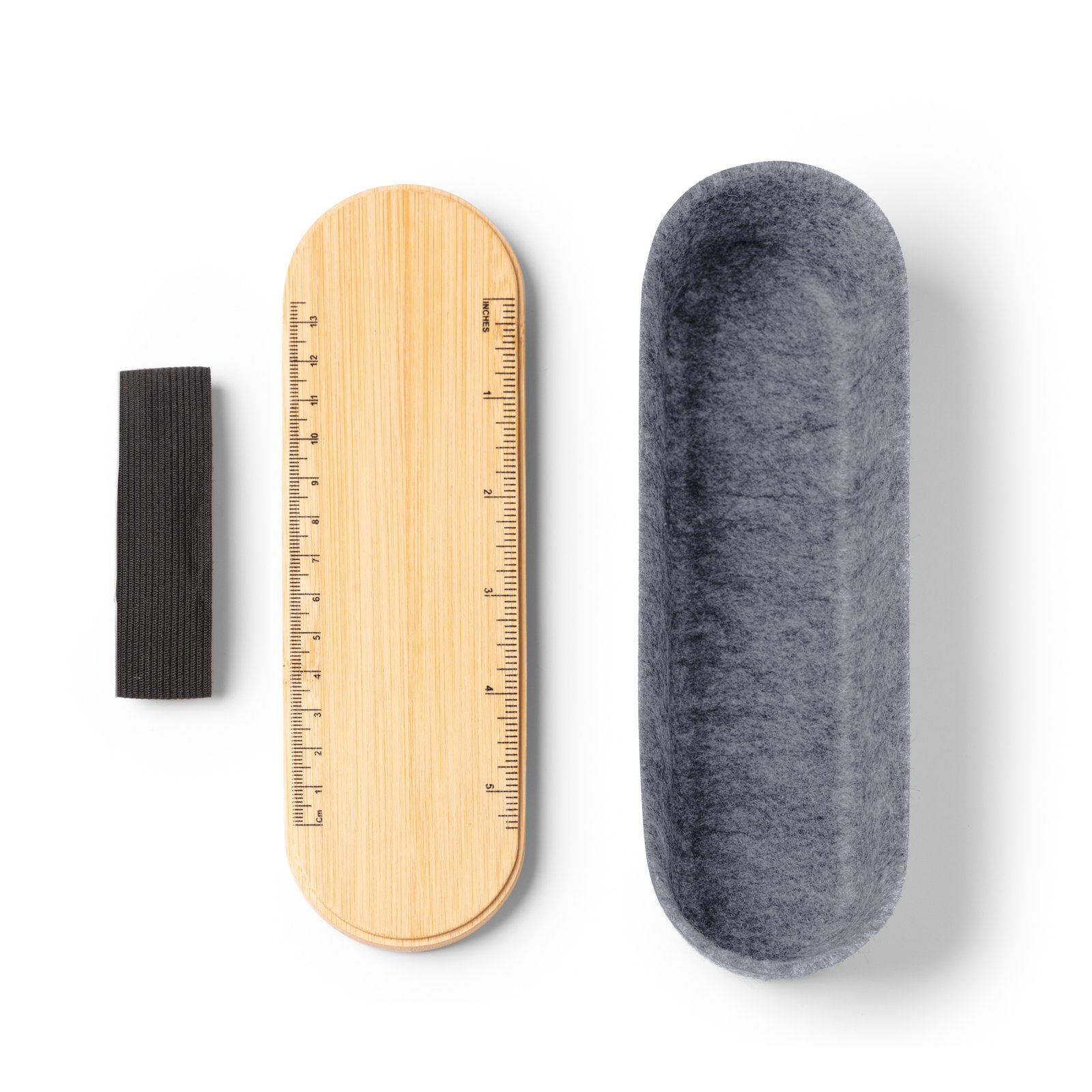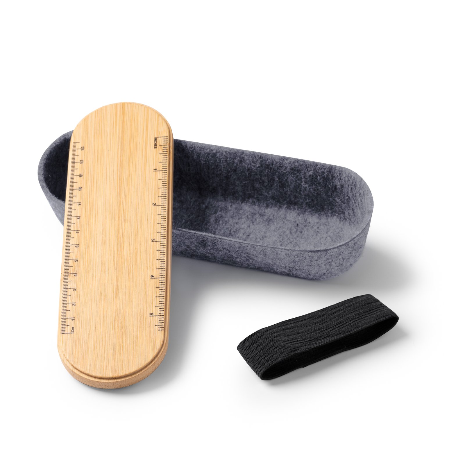 Pencil case with bamboo lid and main structure in recycle felt fabric. In-built ruler on lid and smartphone stand. Presentation in eco design box.