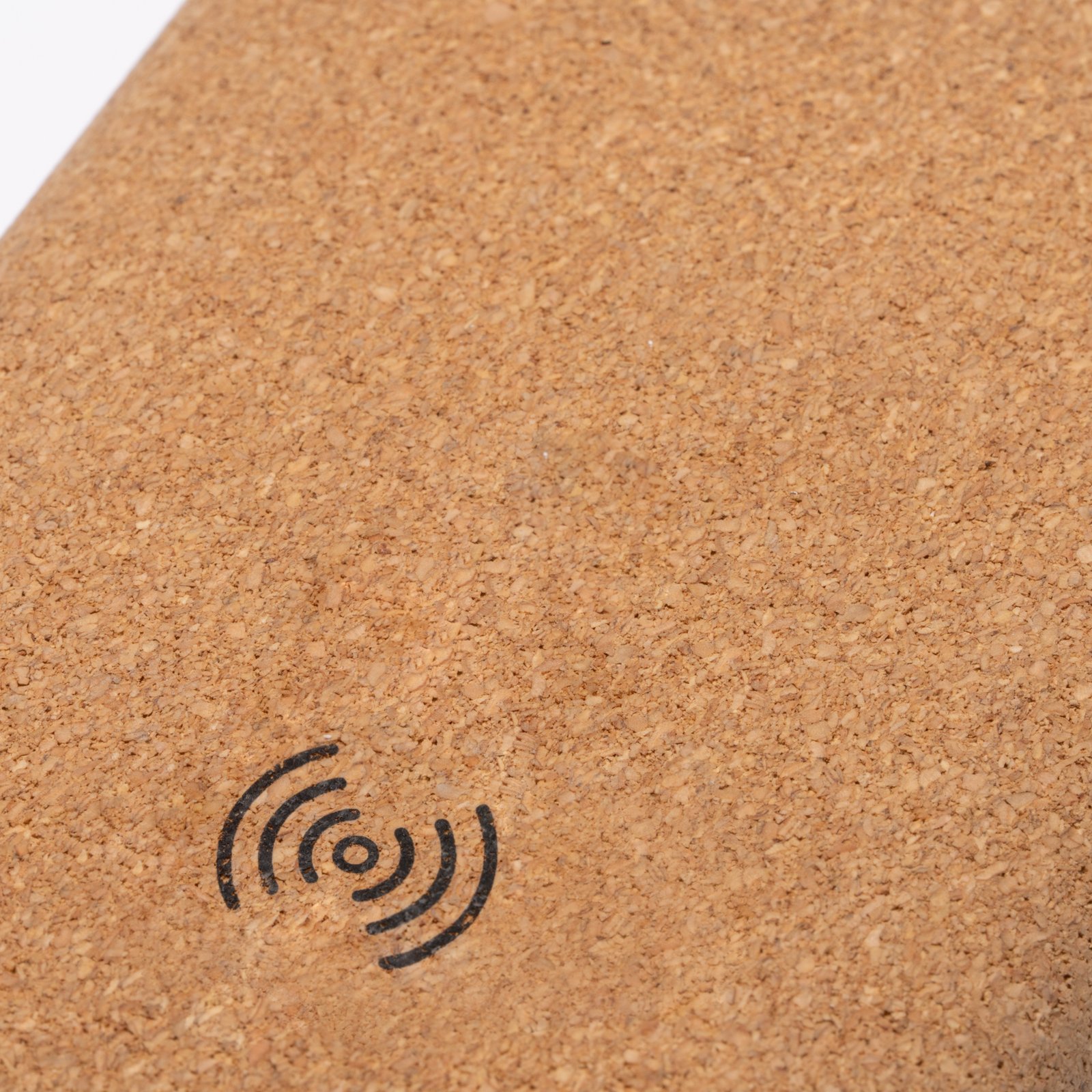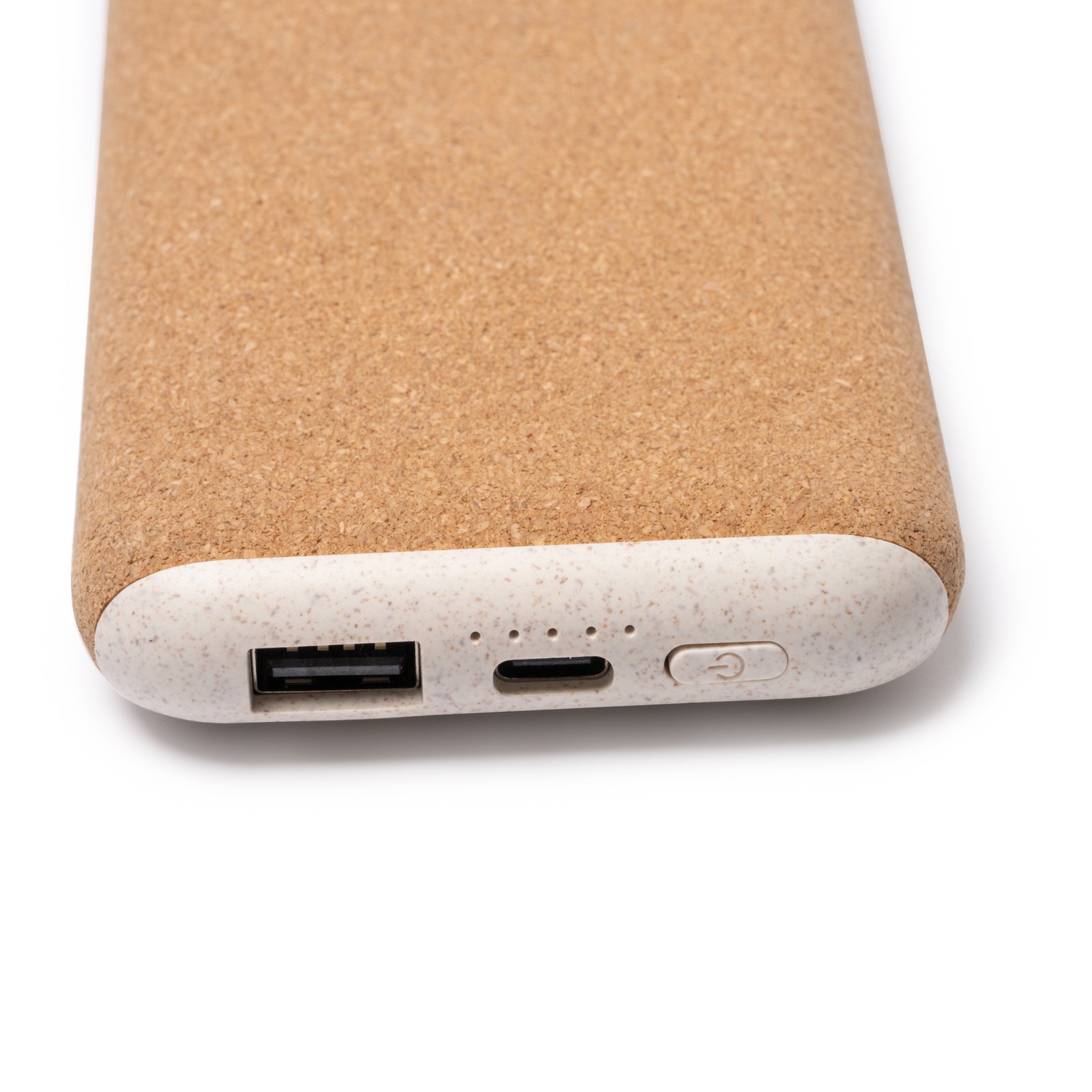 Power bank with structure in cork and wheat fibre. 10.000 mAh capacity. Wireless 15W fast charge. 20W Type C and USB output. Type C cable included. Presentation in eco design box. Composition: Corcho y fibra de trigo Remarks: Double entrée : Type-C et USB
