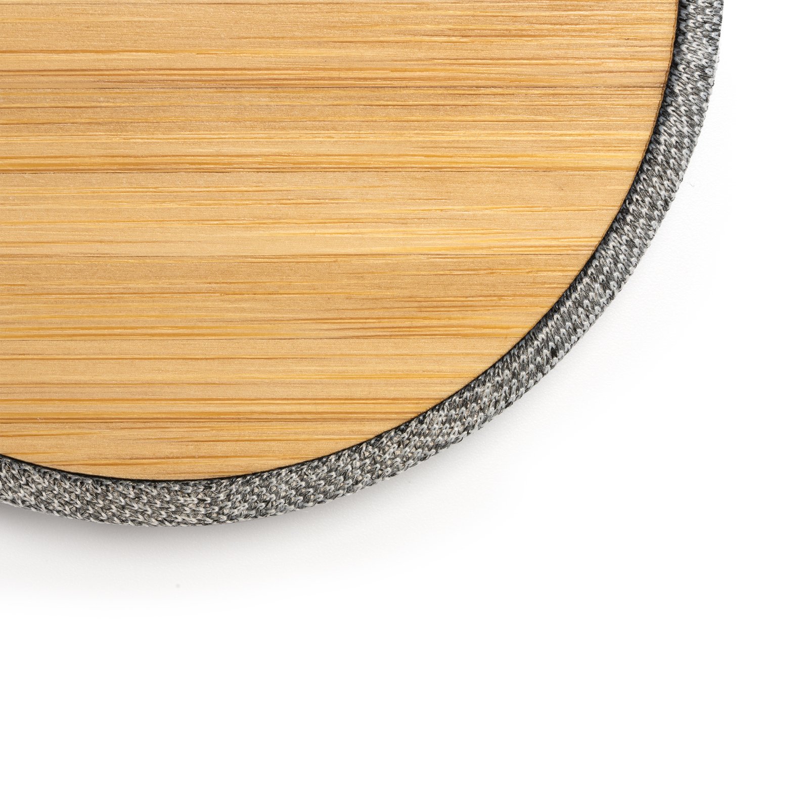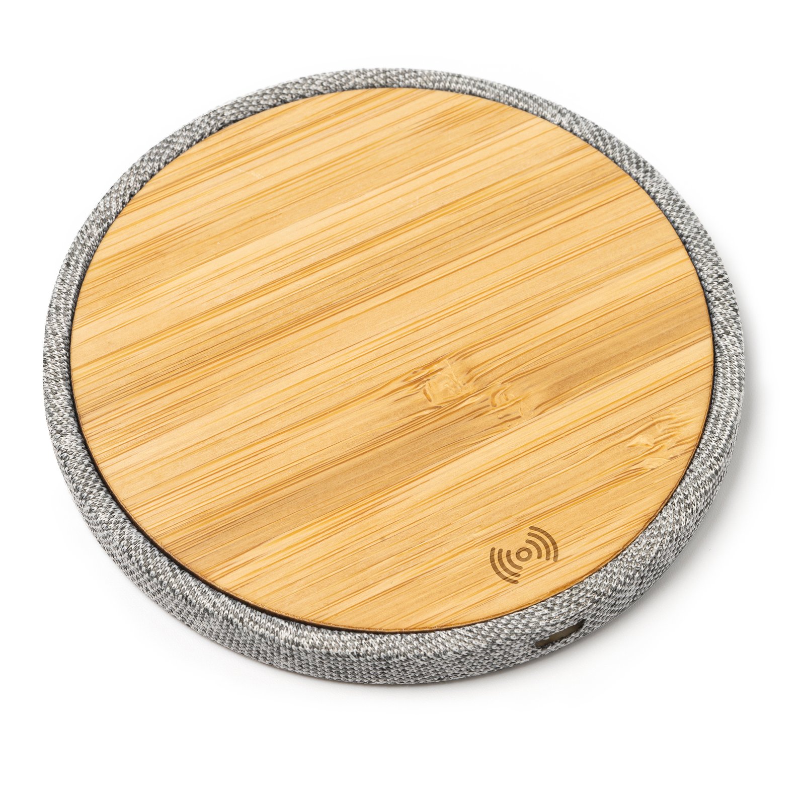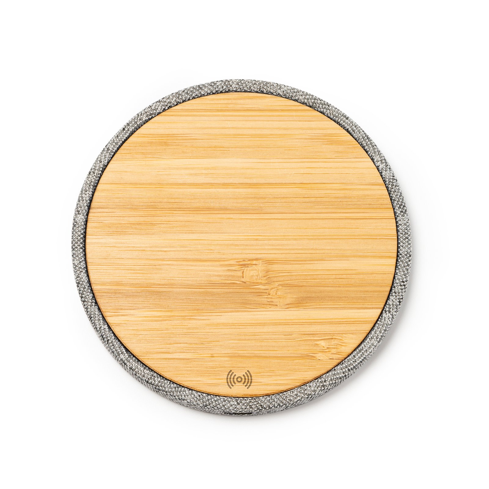 Wireless charger with main structure in bamboo and RPET fabric, compatible with wireless technology devices. 10W output. Type C connection. Cable included. Presentation in eco design box. Composition: Bambú y tejido RPET Remarks: Presentation in eco design box.