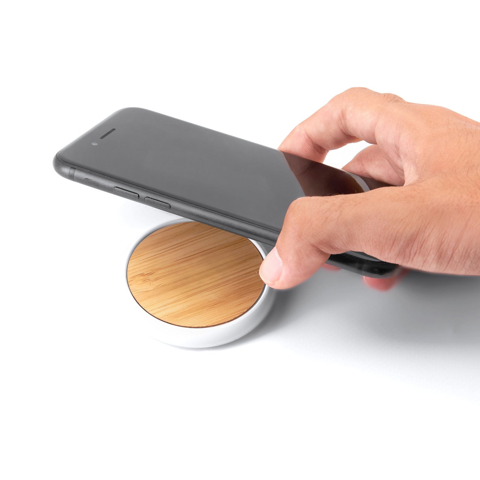Wireless charger made with white ABS body and bamboo surface, with 5W power. Place your smartphone on top of it and leave it to charge. Cable included. Composition: Plastic and bamboo. Remarks: Input Voltage: DC 5V/2.0A