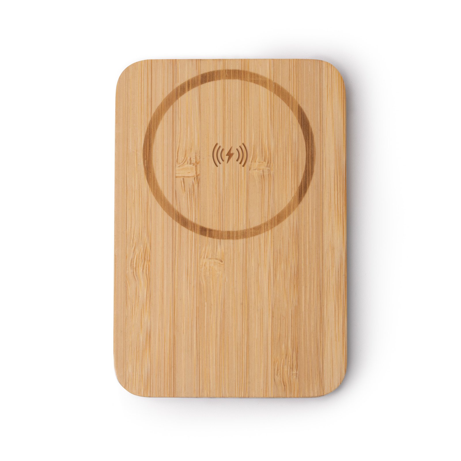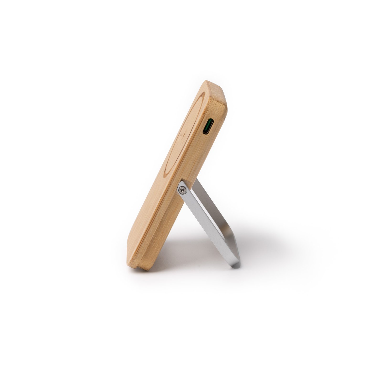 5000 mAh external battery with body made from bamboo. Features a foldable vertical stand in recycled aluminium. Features a magnetic wireless charger for devices compatible with this technology, with a power output of 15 W. Includes charging indicator light. Type-C Connection Cable included. Presentation in eco design box. Composition: Bamboo and recycled aluminium Remarks: Capacity: 5000 mAh